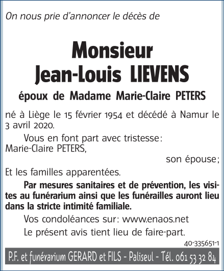 Overleden te Namur (5000) op vrijdag 3 april 2020 op 66-jarige leeftijd