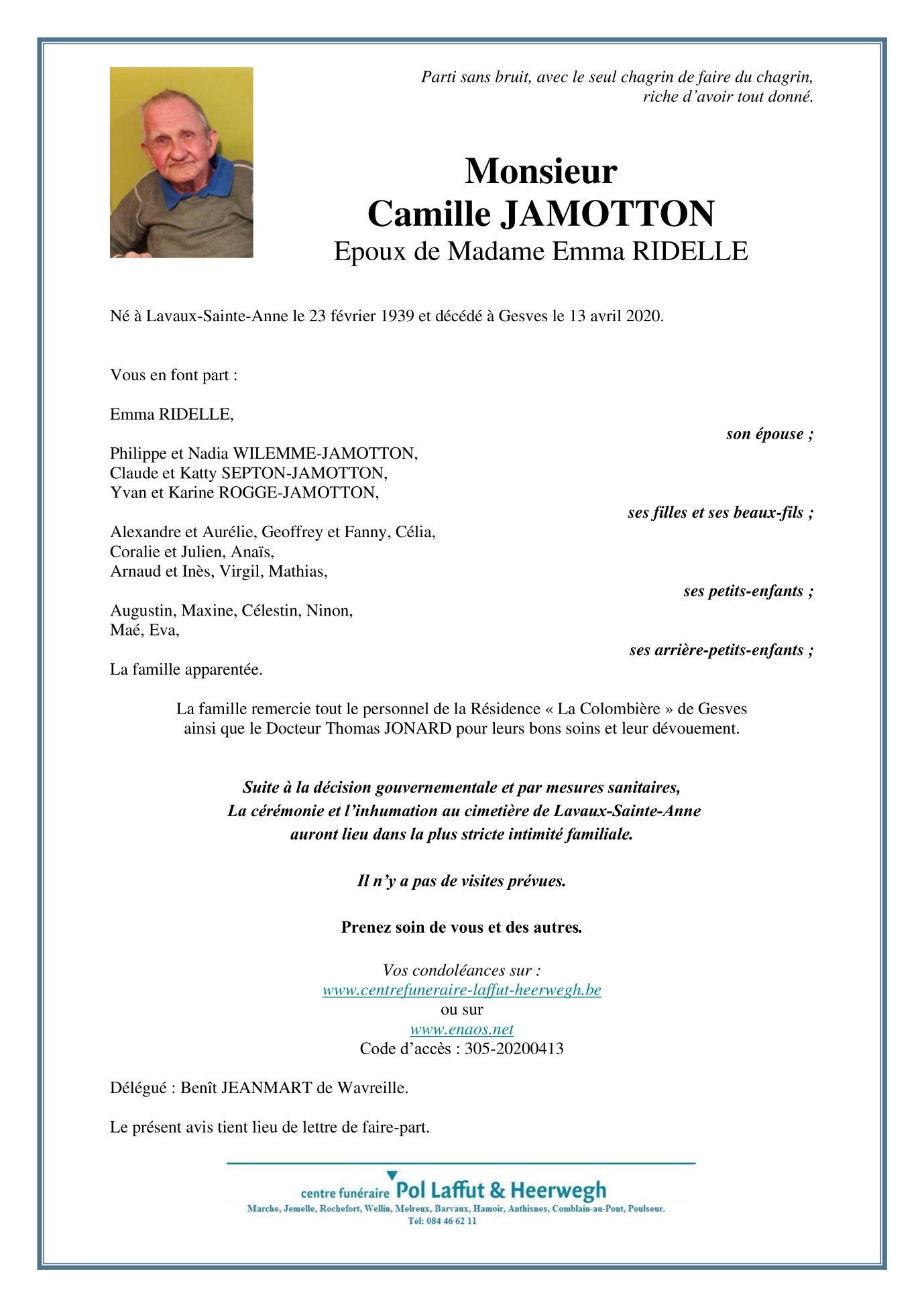 Overleden te Gesves (5340) op maandag 13 april 2020 op 81-jarige leeftijd