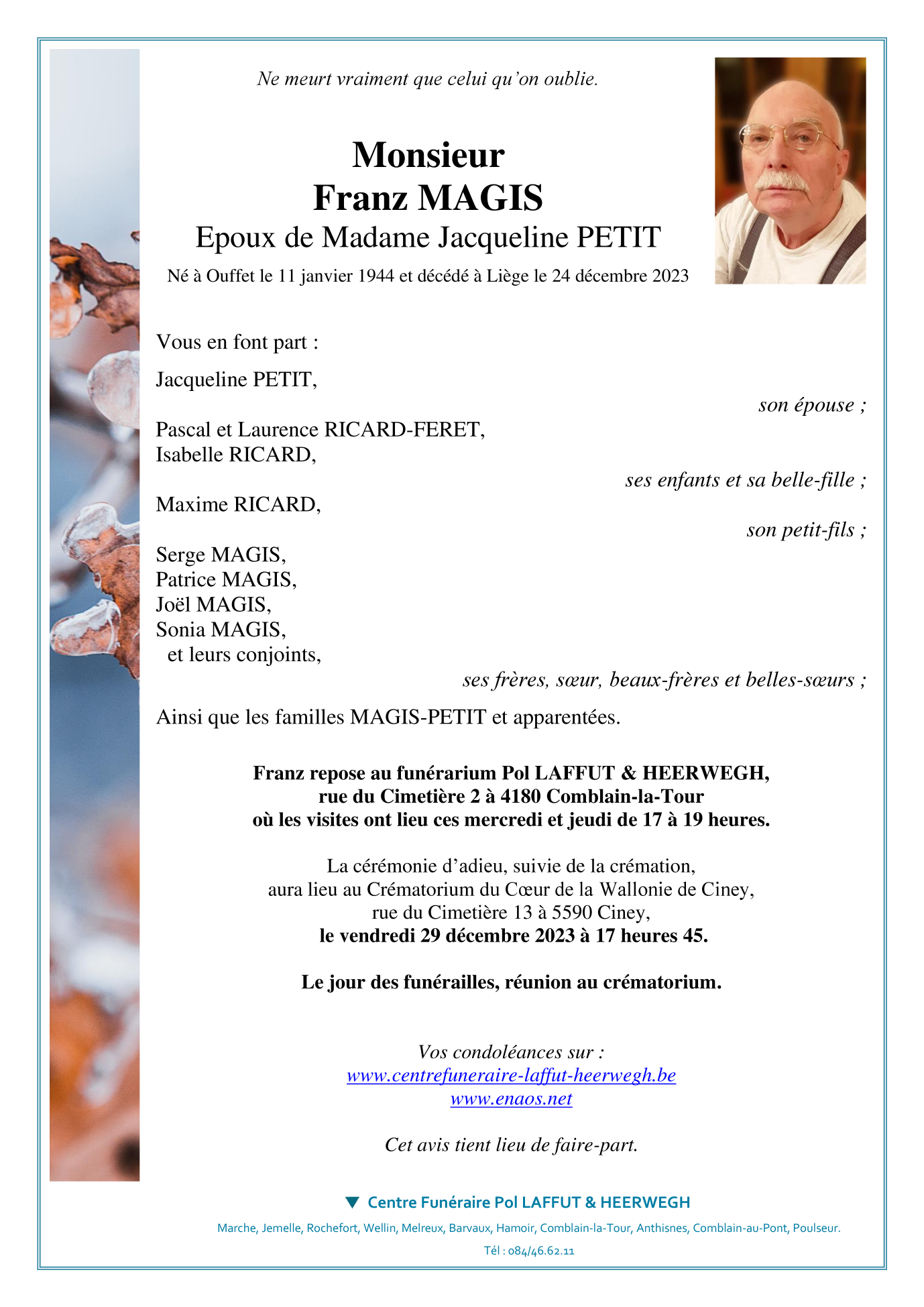 Décédé à Liège (4000) le dimanche 24 décembre 2023 à l'âge de 79 ans