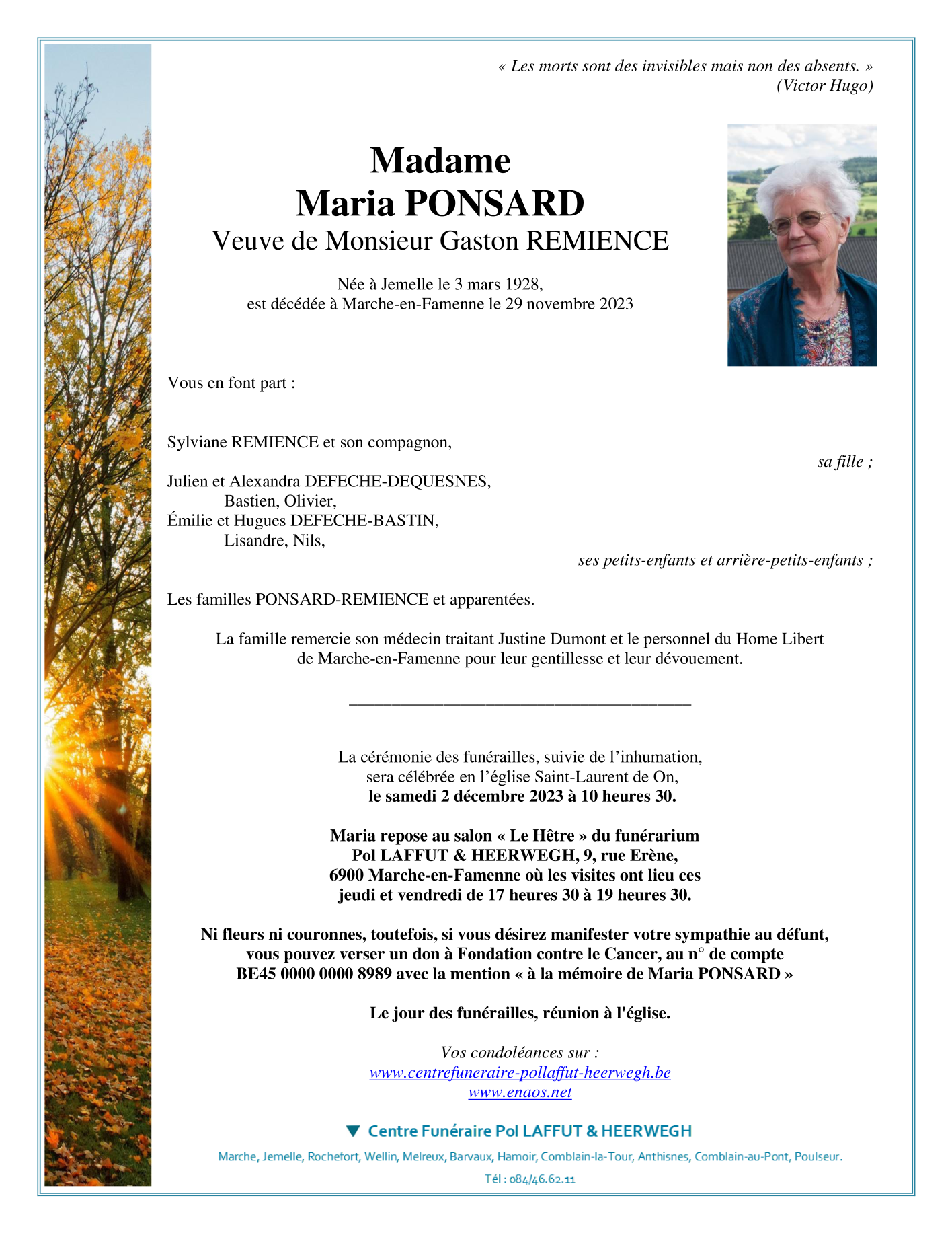 Died in Marche-en-Famenne (6900) on 29 November 2023 at the age of 95 years