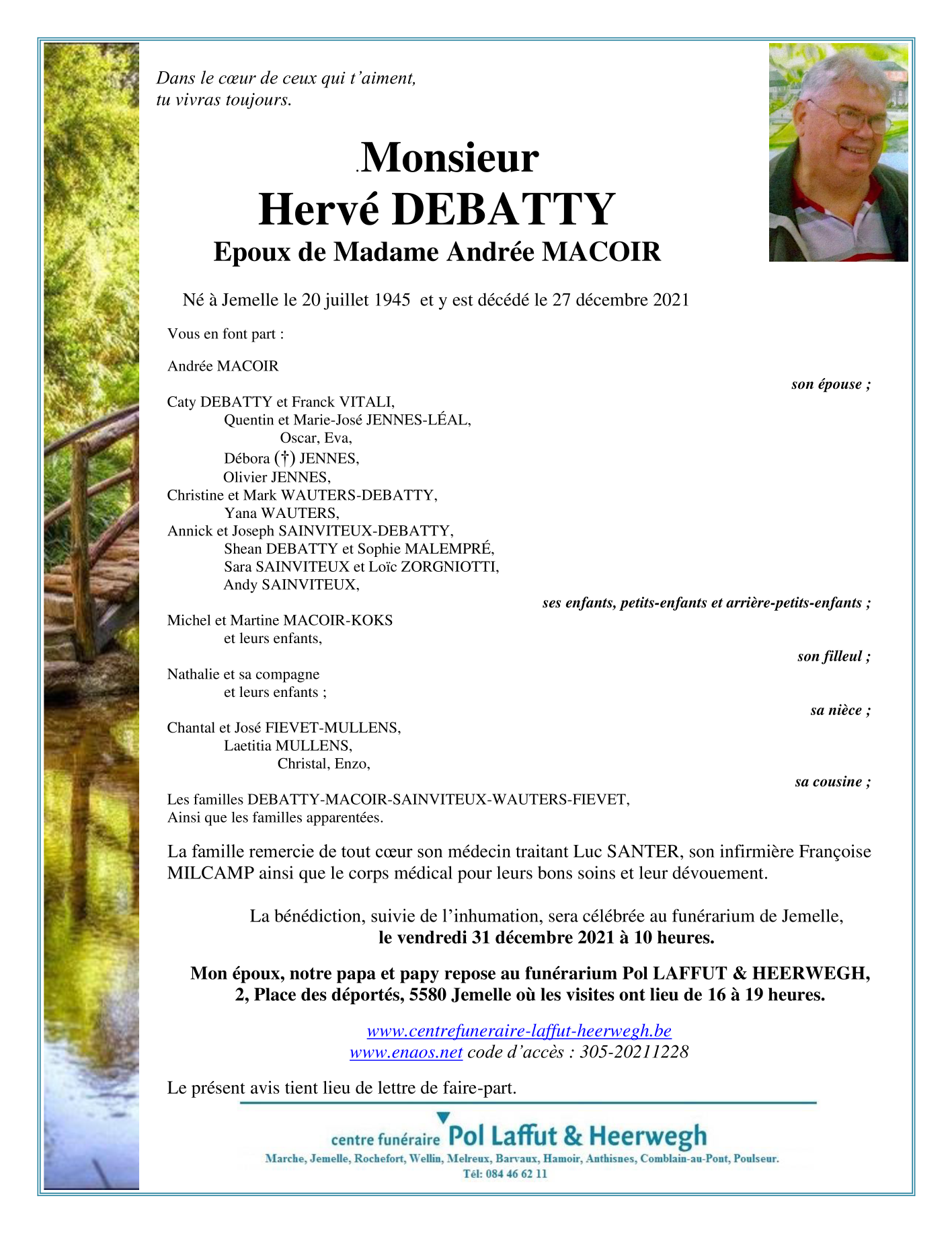 Overleden te Jemelle (5580) op maandag 27 december 2021 op 76-jarige leeftijd