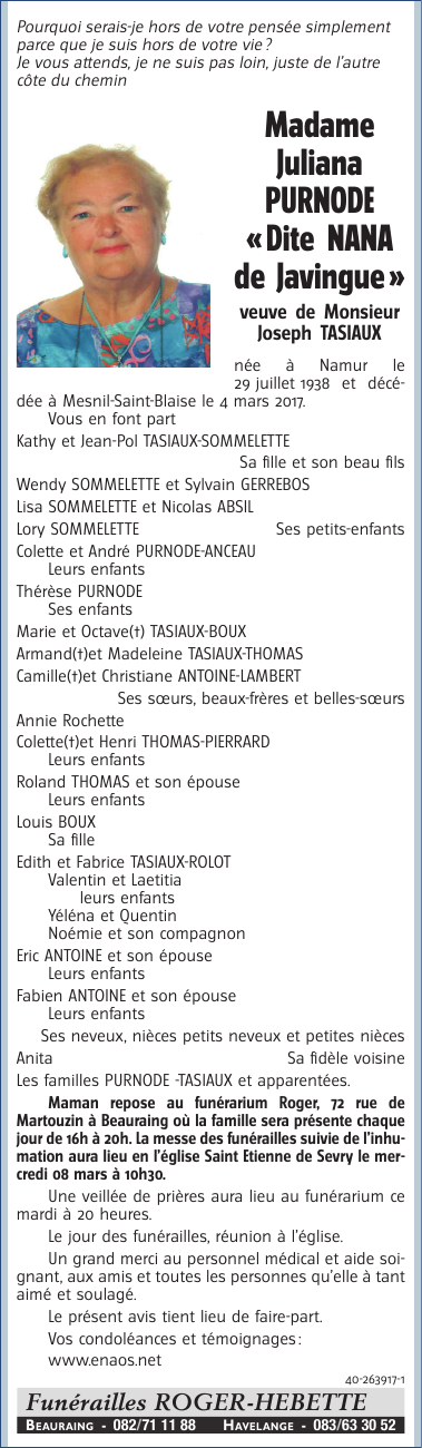 Décédée à Mesnil-Saint-Blaise (5560) le samedi 4 mars 2017 à l'âge de 78 ans