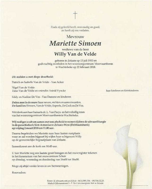 Fallecida en Wachtebeke (9185) el jueves, 22 de febrero de 2018 a la edad de 84 años
