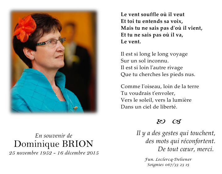 Décédée à La Louvière (7100) le mercredi 16 décembre 2015 à l'âge de 63 ans