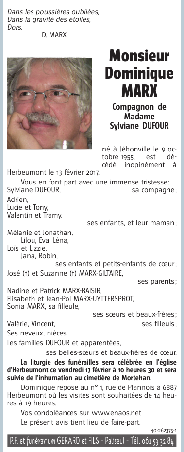 Décédé à Herbeumont (6887) le mardi 14 février 2017 à l'âge de 61 ans