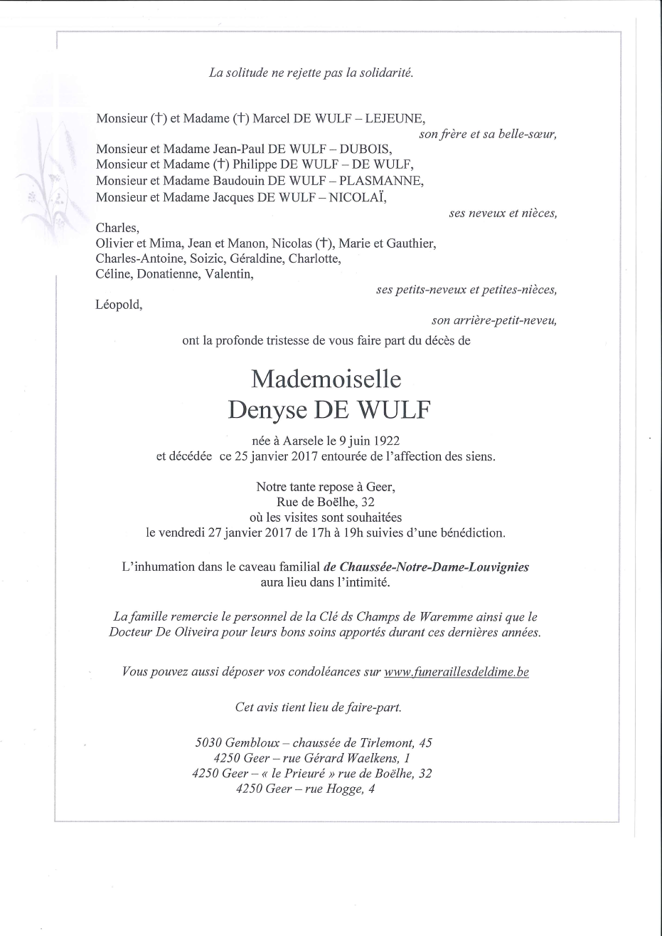 Fallecida en Waremme (4300) el miércoles, 25 de enero de 2017 a la edad de 94 años