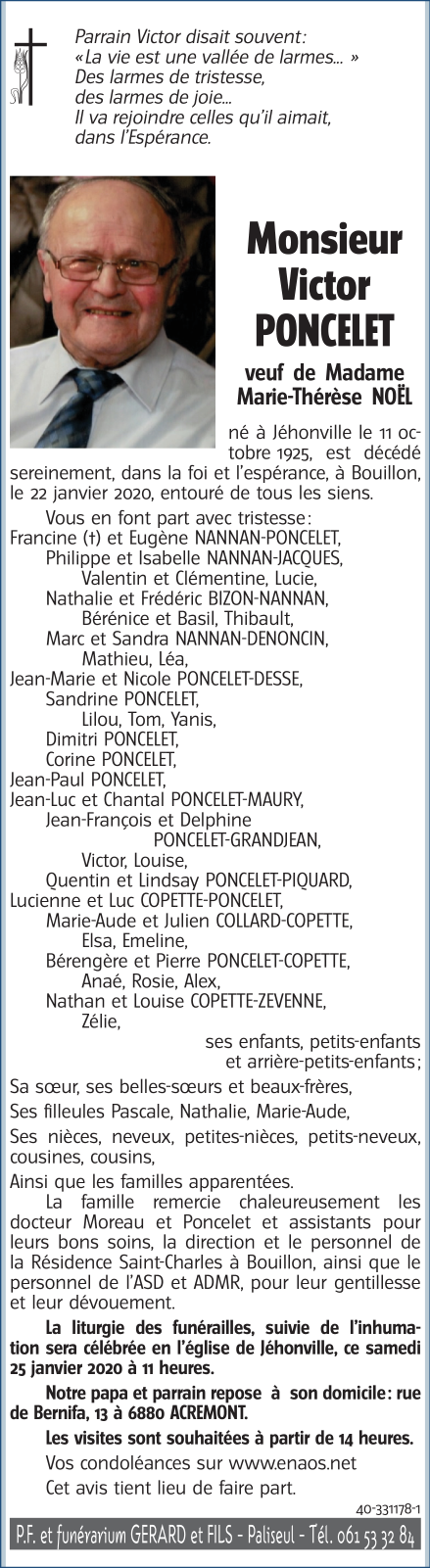 Décédé à Bouillon (6830) le mercredi 22 janvier 2020 à l'âge de 94 ans
