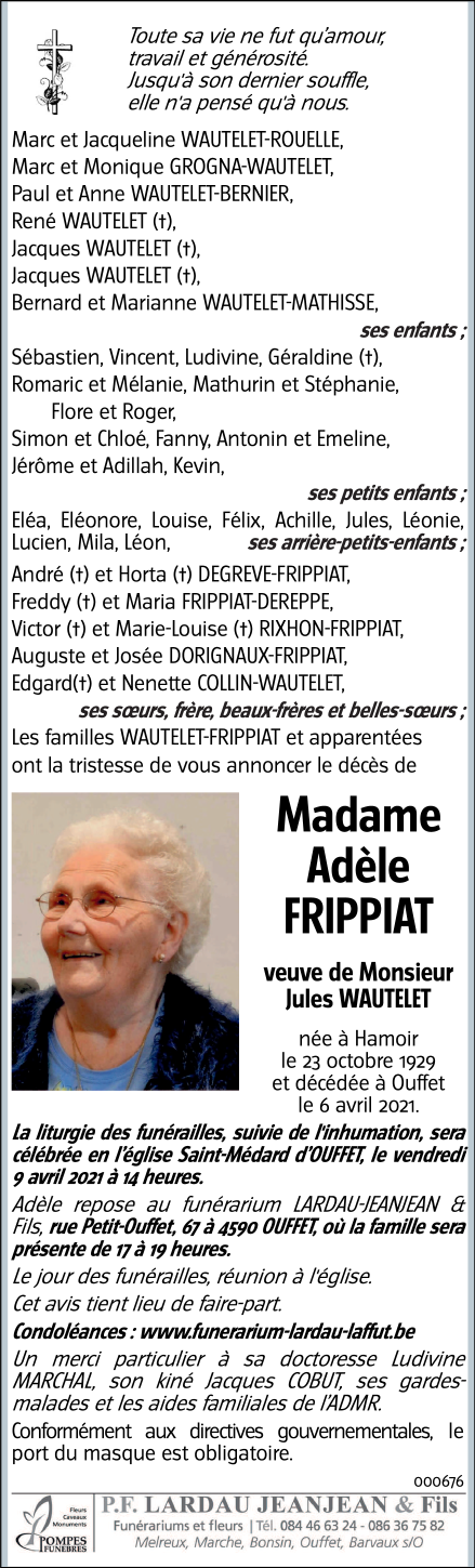 Fallecida en Ouffet (4590) el miércoles, 7 de abril de 2021 a la edad de 91 años