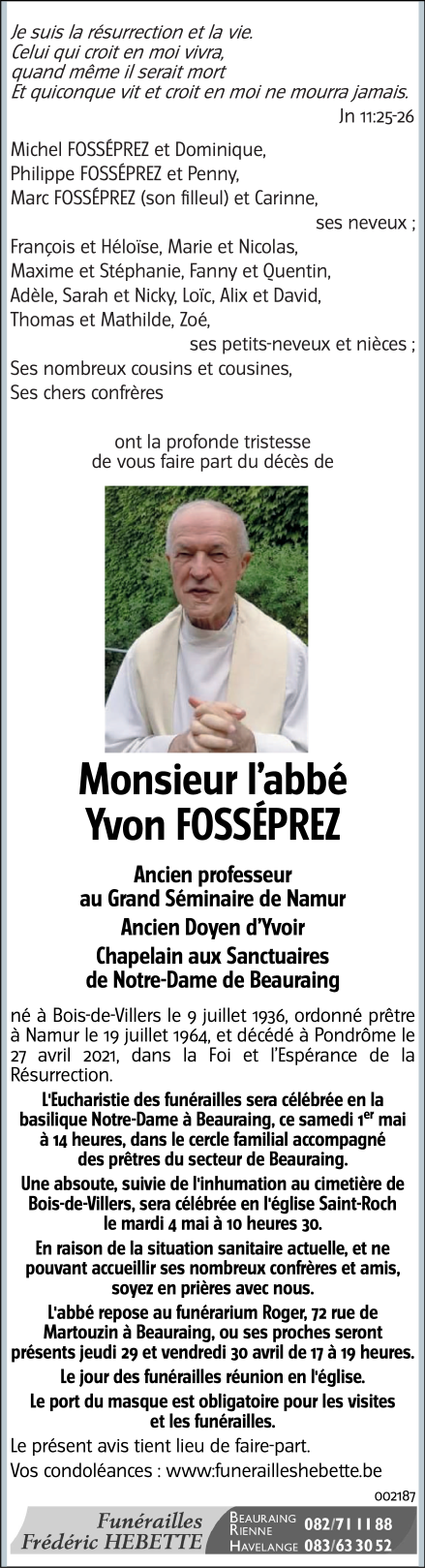 Fallecido en Pondrôme (5574) el martes, 27 de abril de 2021 a la edad de 84 años