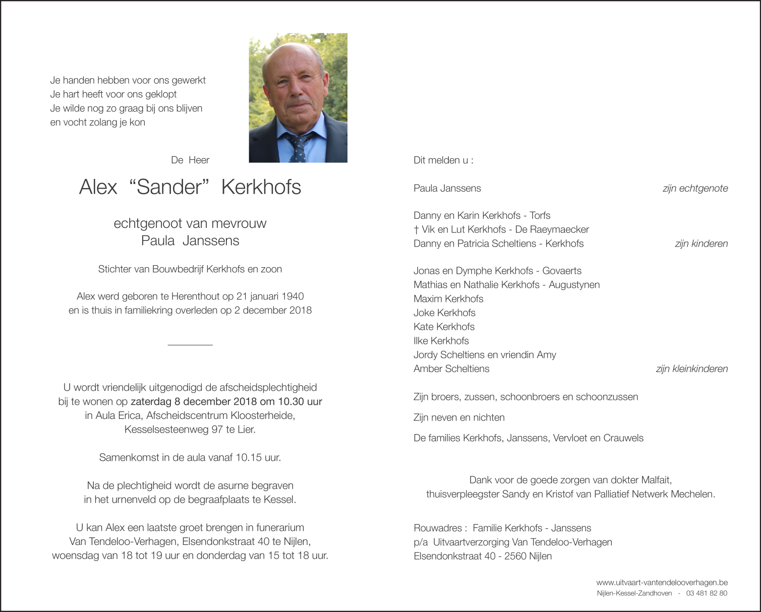 Décédé à Kessel (2560) le dimanche 2 décembre 2018 à l'âge de 78 ans