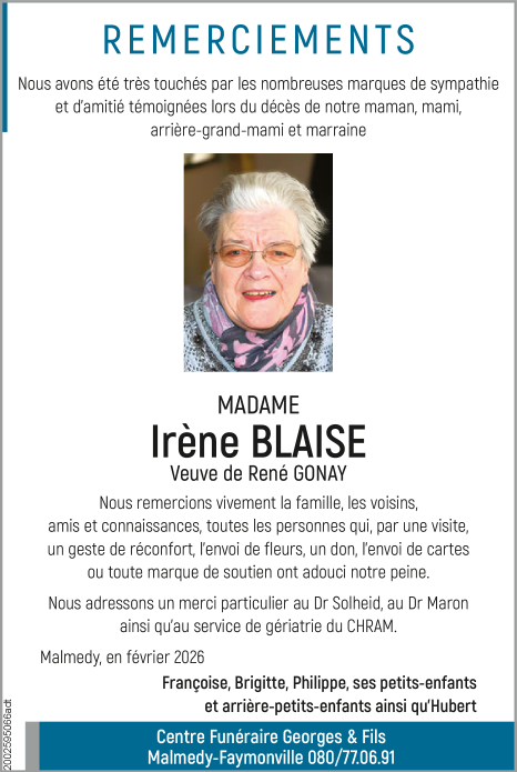 Décédée à Malmedy (4960) le samedi 14 février 2026 à l'âge de 82 ans