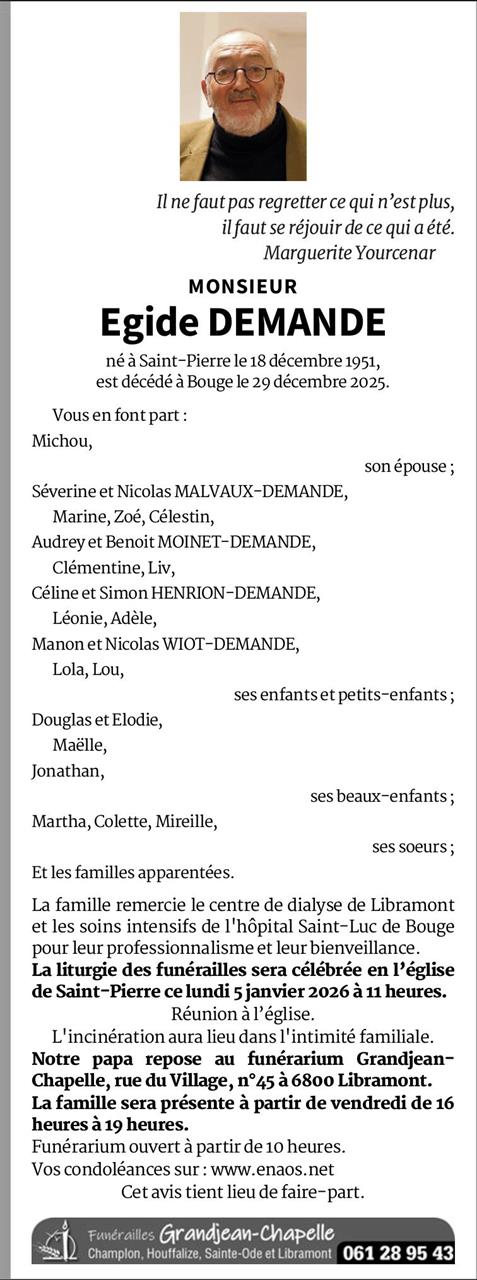 Fallecido en Bouge (5004) el lunes, 29 de diciembre de 2025 a la edad de 74 años