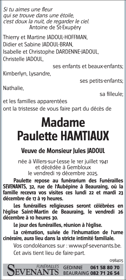 Décédée à Gembloux (5030) le vendredi 19 décembre 2025 à l'âge de 84 ans