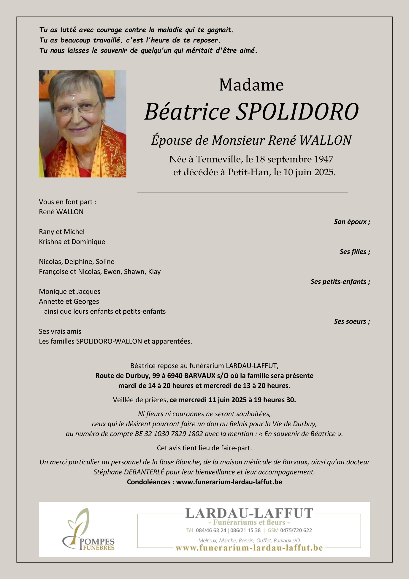 Décédée à Petit-Han (6940) le mardi 10 juin 2025 à l'âge de 77 ans