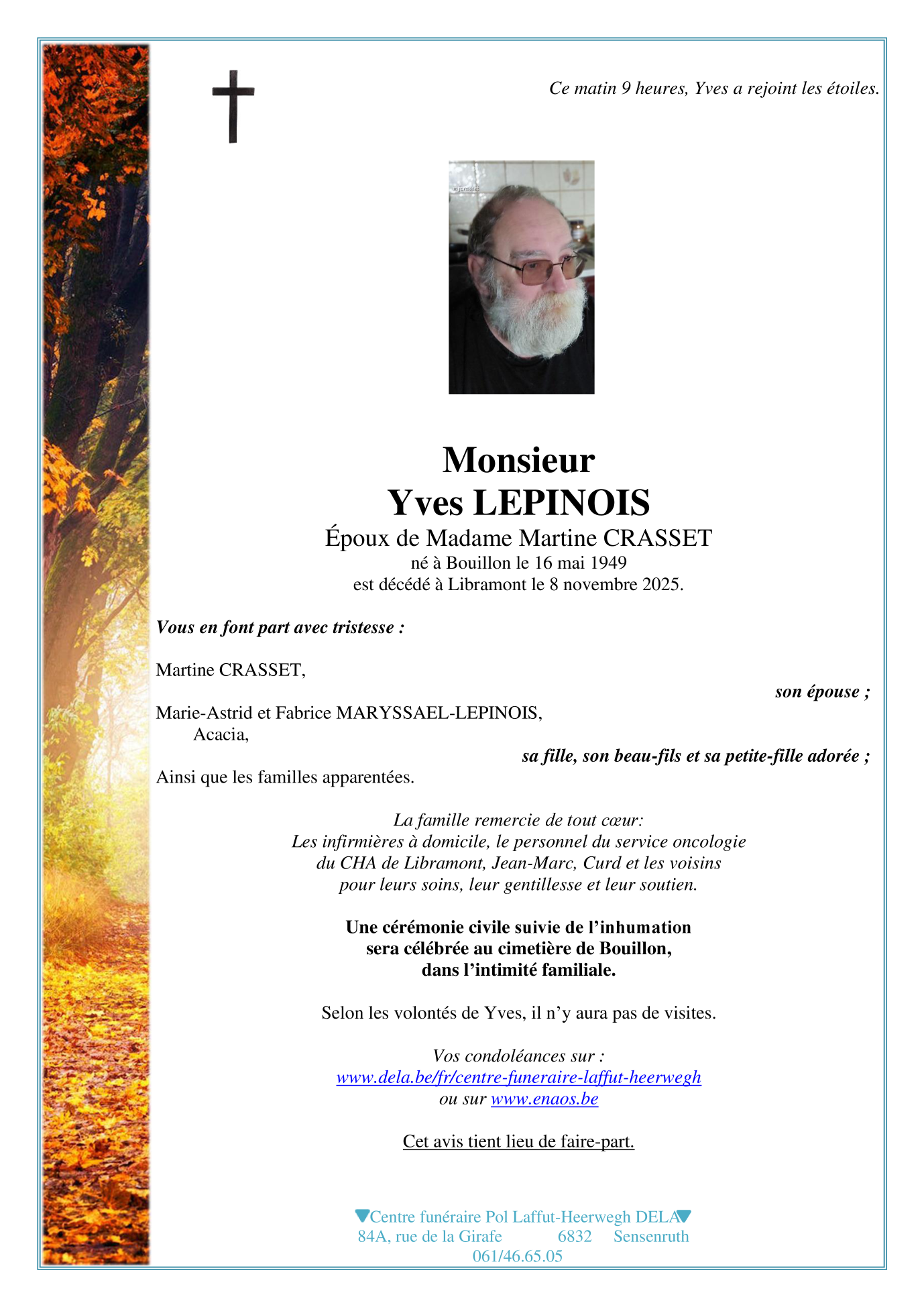 Fallecido en Libramont-Chevigny (6800) el sábado, 8 de noviembre de 2025 a la edad de 76 años