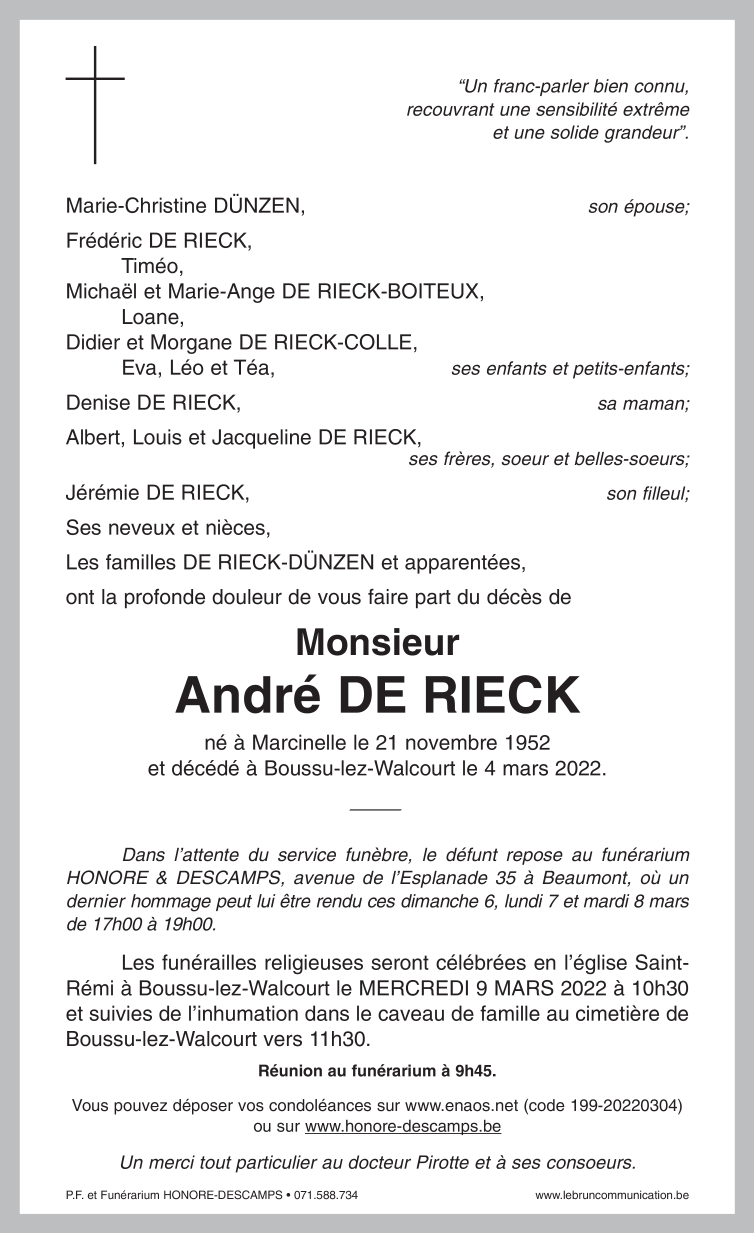 Décédé à Boussu-lez-Walcourt (6440) le vendredi 4 mars 2022 à l'âge de 69 ans