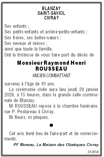 Died in Civray (86400, France) on 24 January 2026 at the age of 91 years