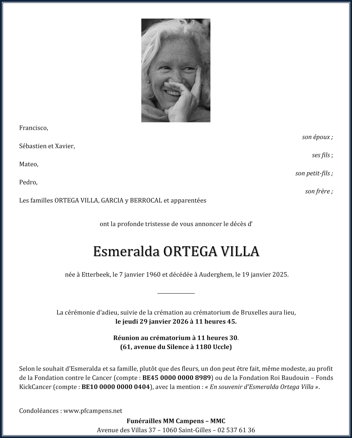 Décédée à Auderghem (1160) le lundi 19 janvier 2026 à l'âge de 66 ans