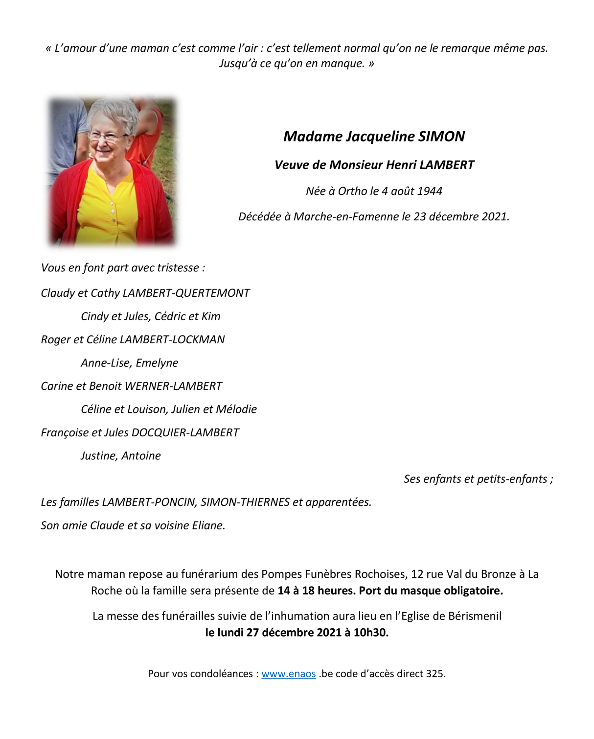 Décédée à Marche-en-Famenne (6900) le jeudi 23 décembre 2021 à l'âge de 77 ans