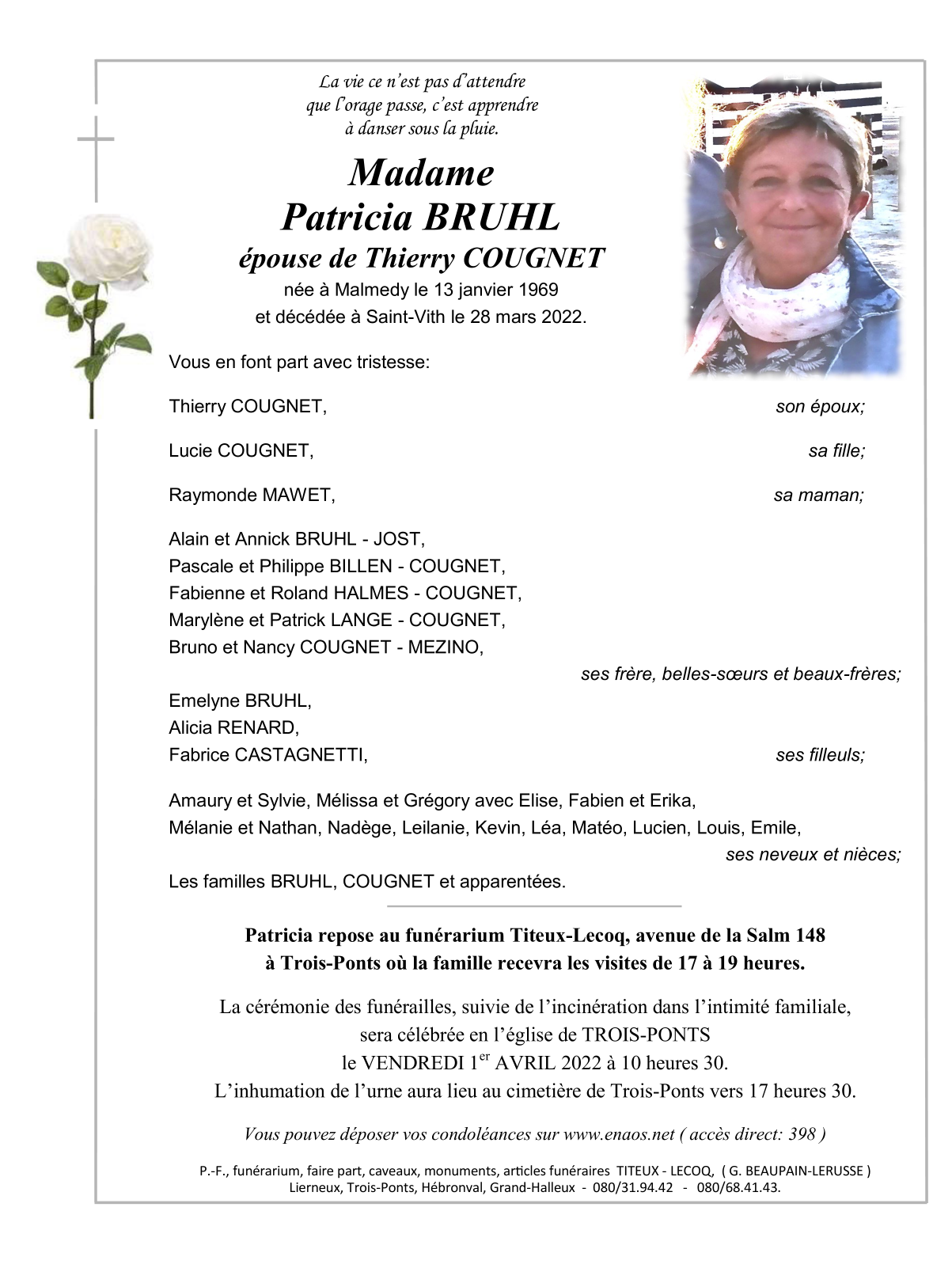 Décédée à Saint-Vith (4780) le lundi 28 mars 2022 à l'âge de 53 ans