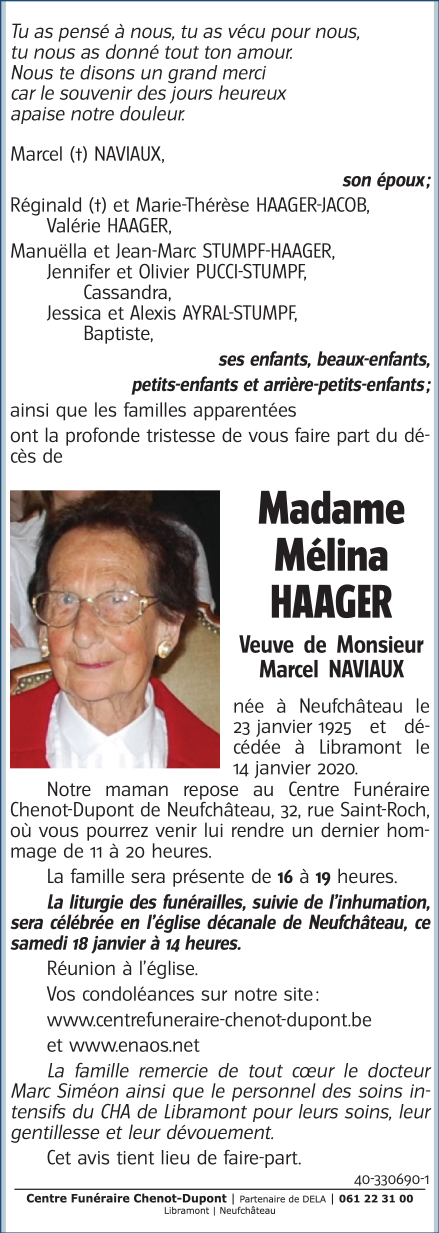 Décédée à Libramont (6800) le mardi 14 janvier 2020 à l'âge de 94 ans