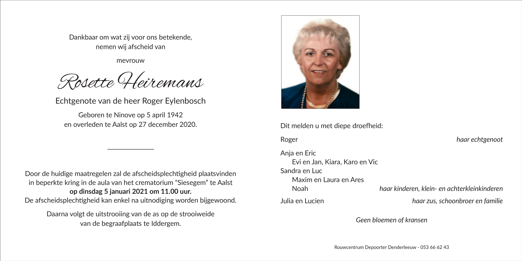 Décédée à Aalst (9300) le dimanche 27 décembre 2020 à l'âge de 78 ans