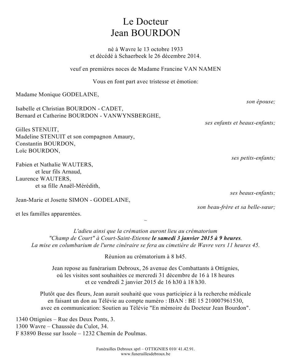 Décédé à Schaerbeek (1030) le vendredi 26 décembre 2014 à l'âge de 81 ans