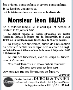 Décédé à Fraiture (4557) le vendredi 22 janvier 2016 à l'âge de 74 ans