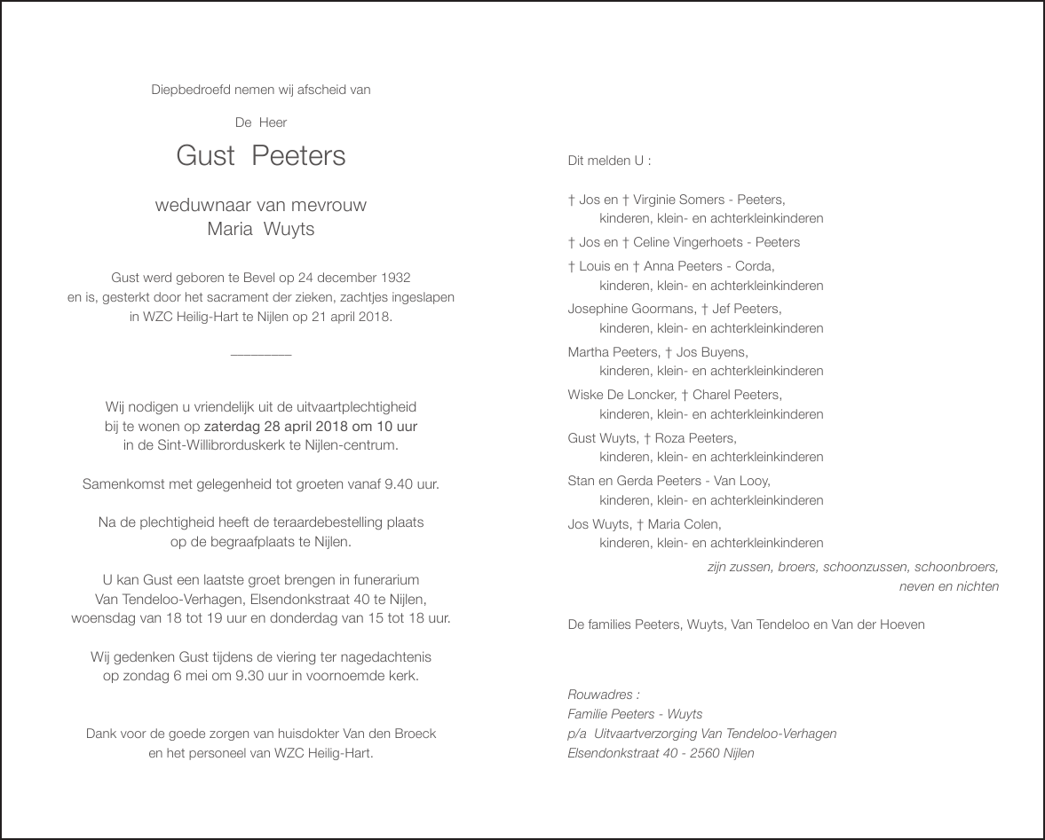 Décédé à Nijlen (2560) le samedi 21 avril 2018 à l'âge de 85 ans