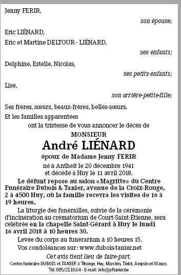 Décédé à Huy (4500) le mercredi 11 avril 2018 à l'âge de 76 ans