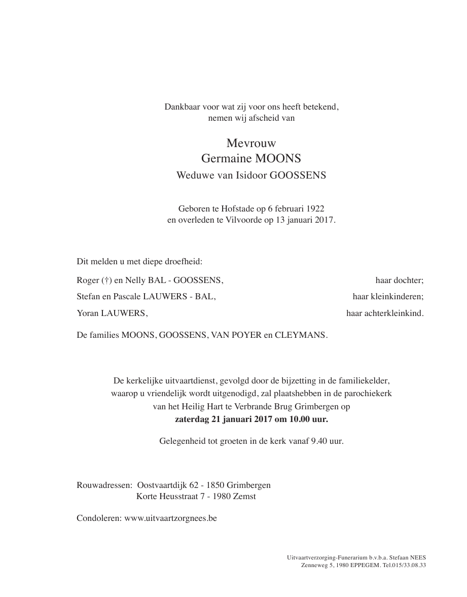 Décédée à Vilvoorde (1800) le vendredi 13 janvier 2017 à l'âge de 94 ans