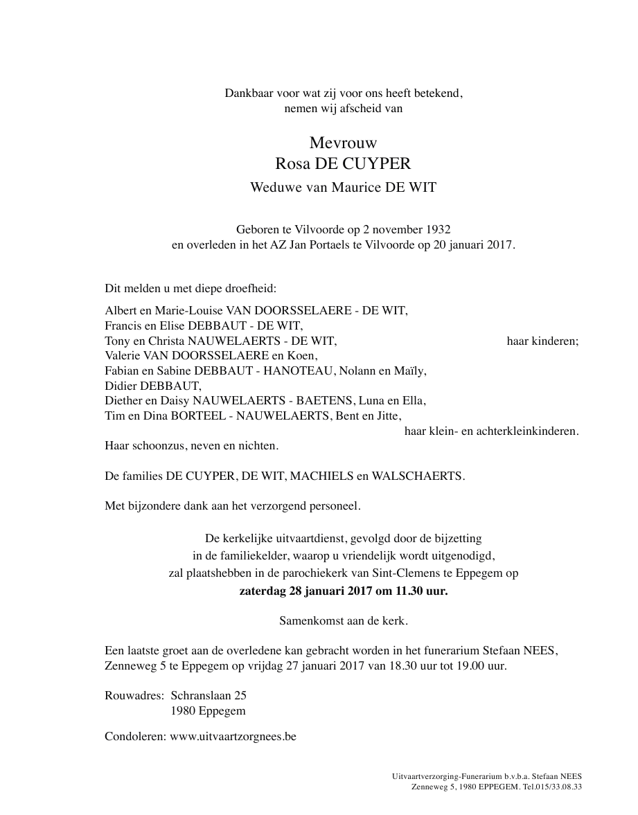 Décédée à Vilvoorde (1800) le vendredi 20 janvier 2017 à l'âge de 84 ans