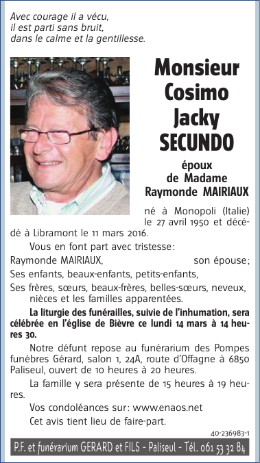 Décédé à Libramont (6800) le vendredi 11 mars 2016 à l'âge de 65 ans