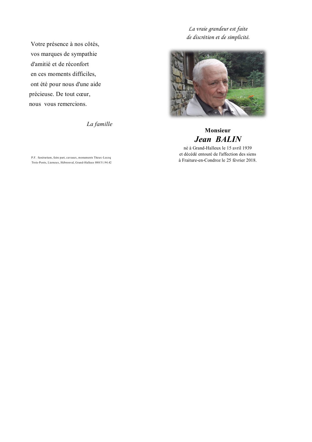Fallecido en Fraiture (4557) el domingo, 25 de febrero de 2018 a la edad de 78 años