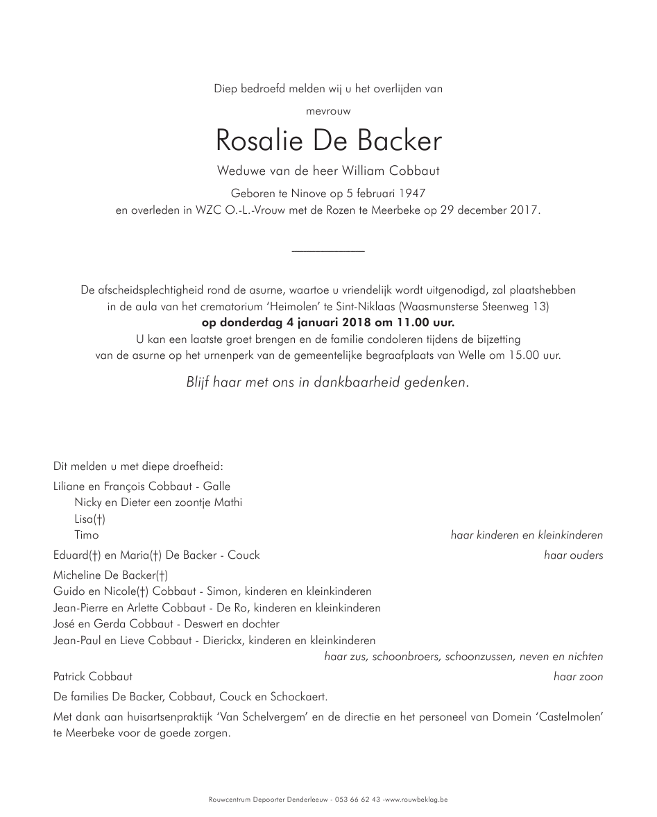 Décédée à Meerbeke (9402) le vendredi 29 décembre 2017 à l'âge de 70 ans