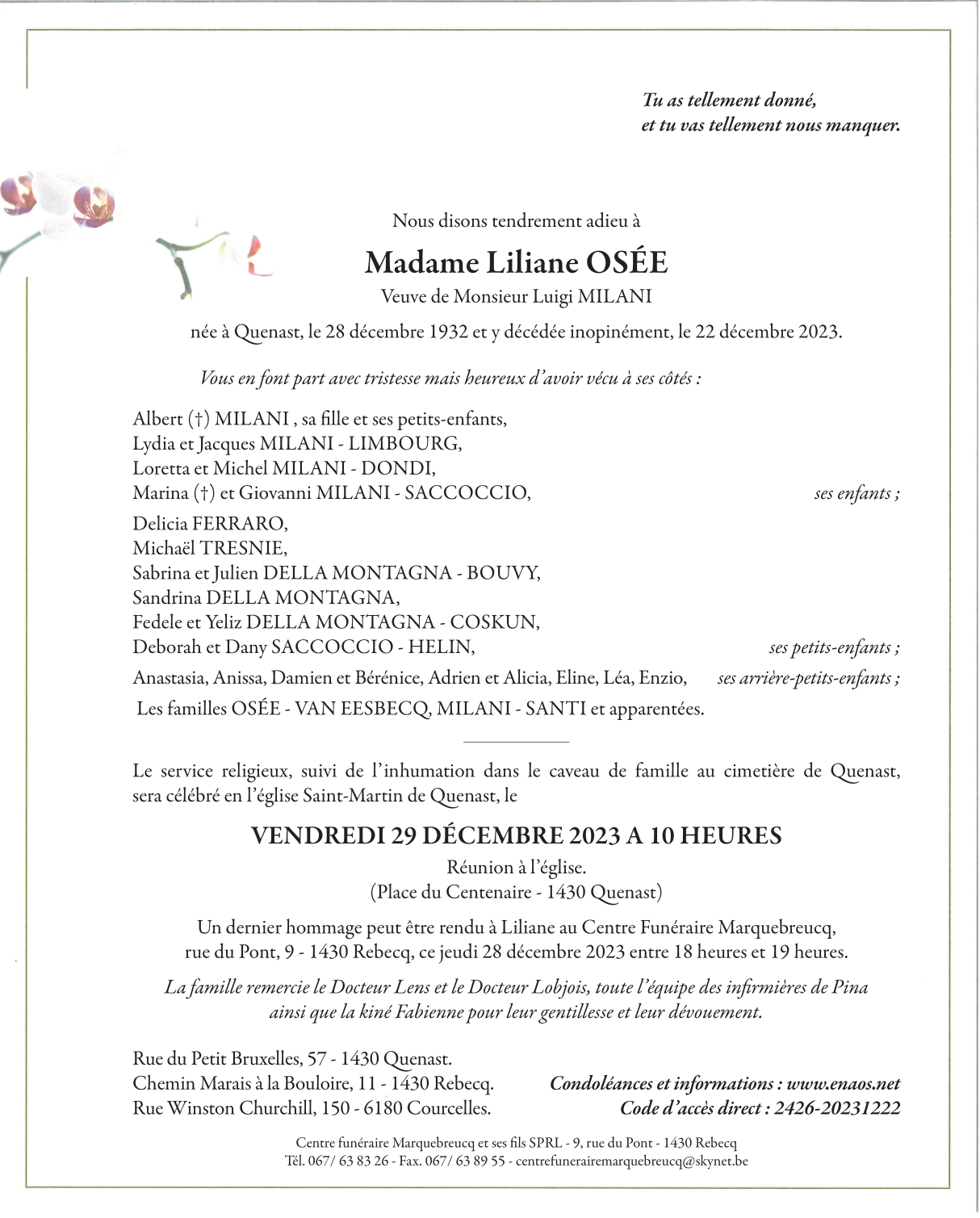 Décédée à Quenast (1430) le vendredi 22 décembre 2023 à l'âge de 90 ans