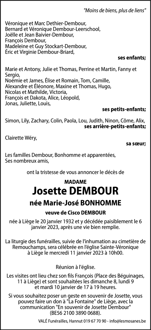 Décédée à Liège (4000) le vendredi 6 janvier 2023 à l'âge de 90 ans