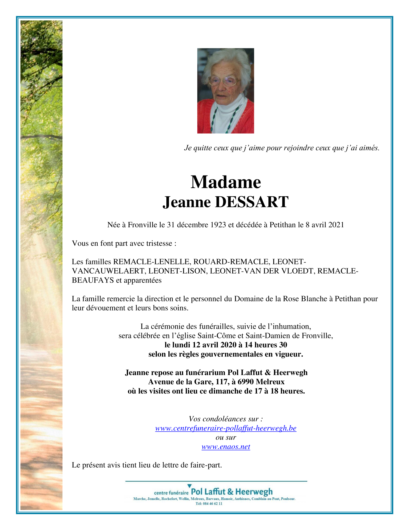 Overleden te Petit-Han (6940) op donderdag 8 april 2021 op 97-jarige leeftijd