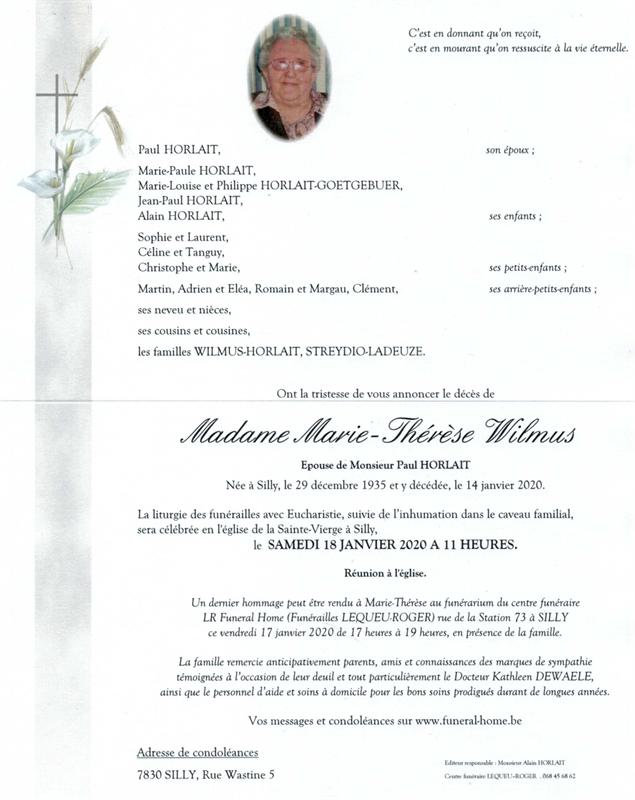 Décédée à Silly (7830) le mardi 14 janvier 2020 à l'âge de 84 ans