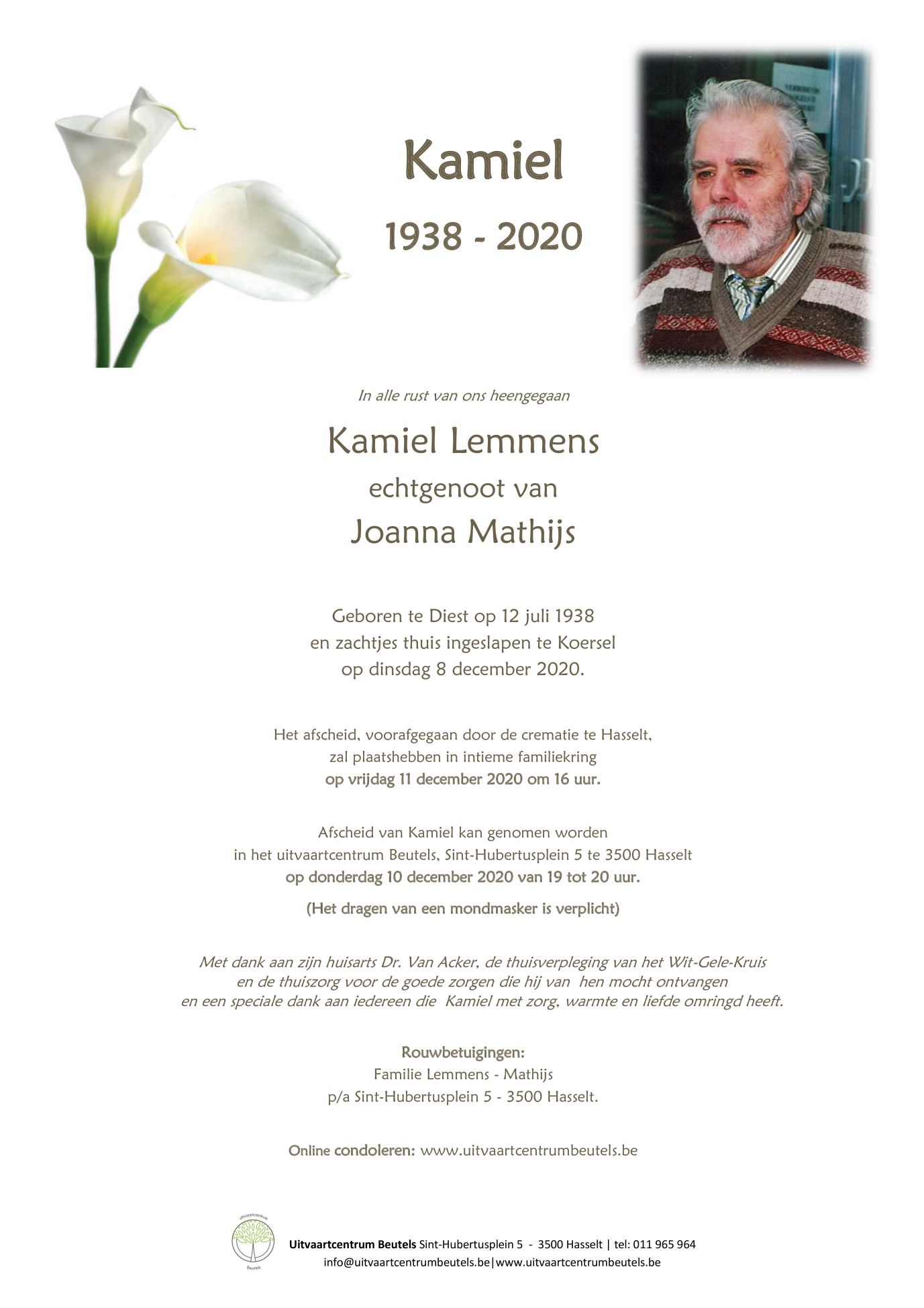 Overleden te Koersel (3582) op dinsdag 8 december 2020 op 82-jarige leeftijd