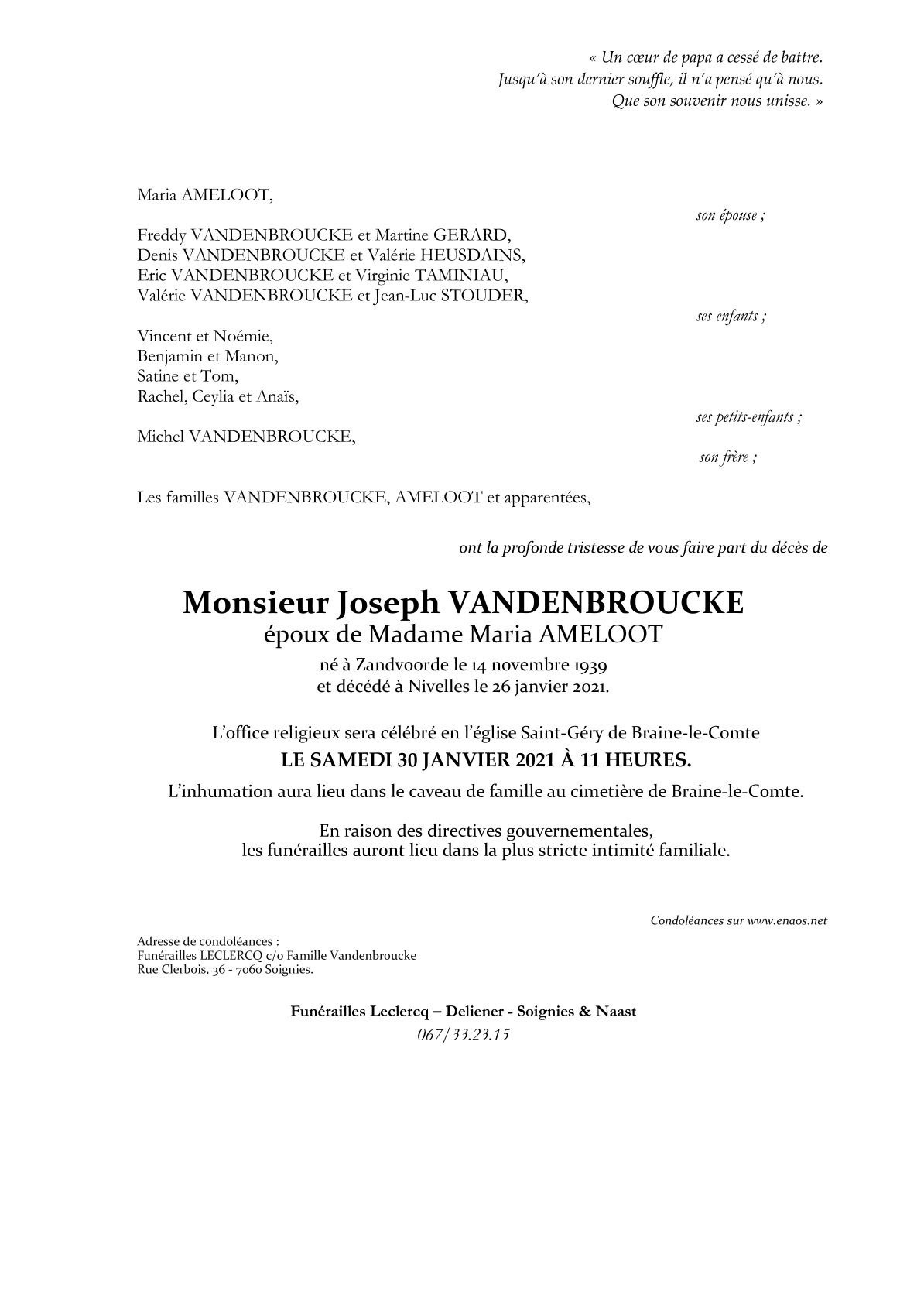 Fallecido en Nivelles (1400) el martes, 26 de enero de 2021 a la edad de 81 años