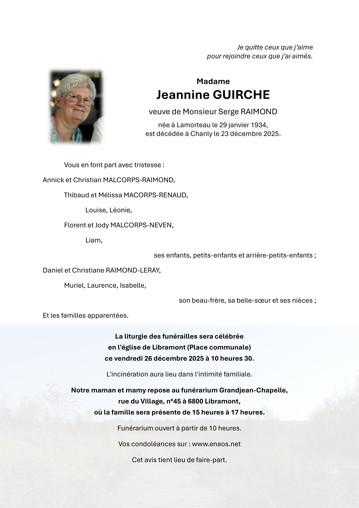 Décédée à Chanly (6921) le mardi 23 décembre 2025 à l'âge de 91 ans
