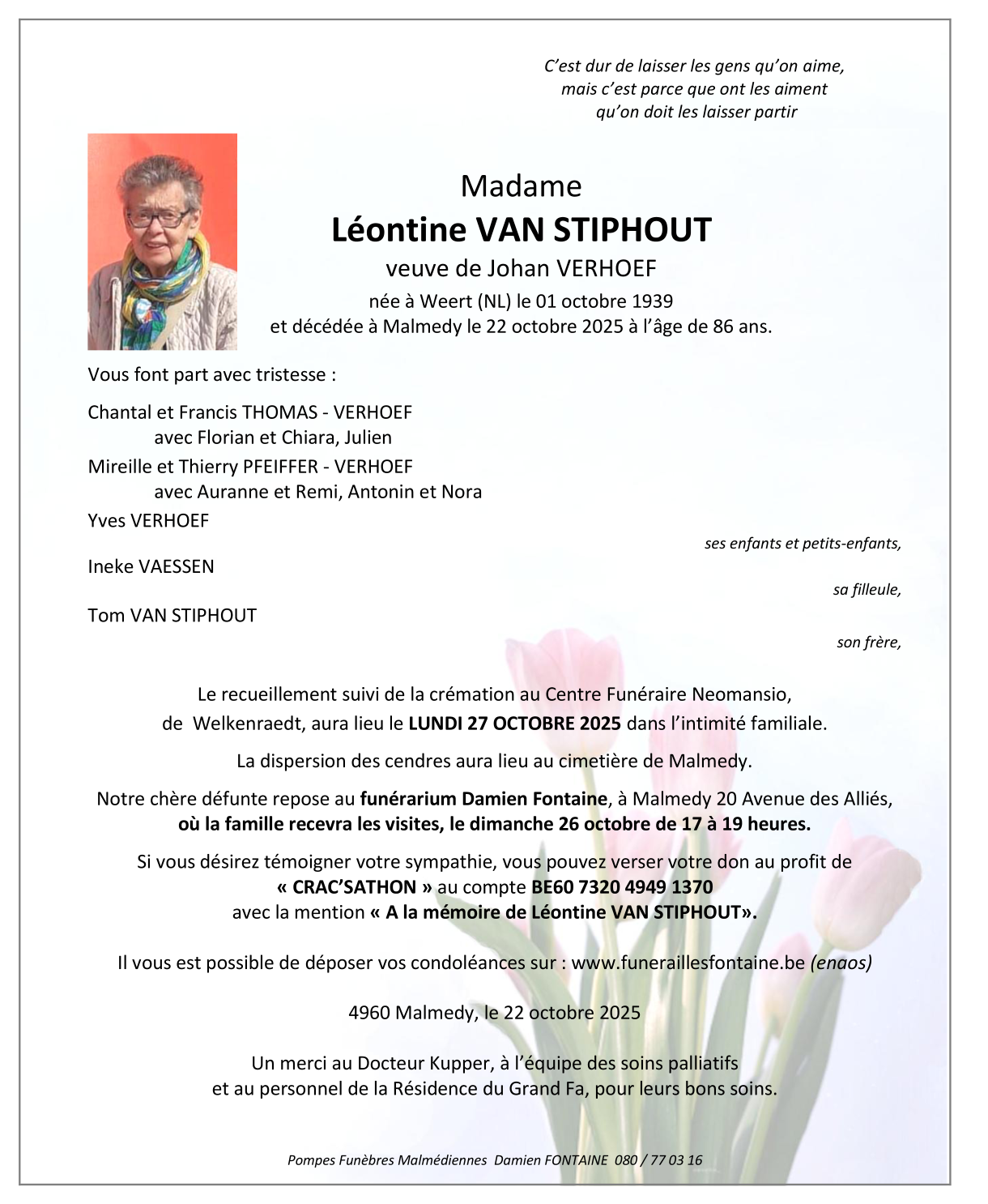 Décédée à Malmedy (4960) le mercredi 22 octobre 2025 à l'âge de 86 ans