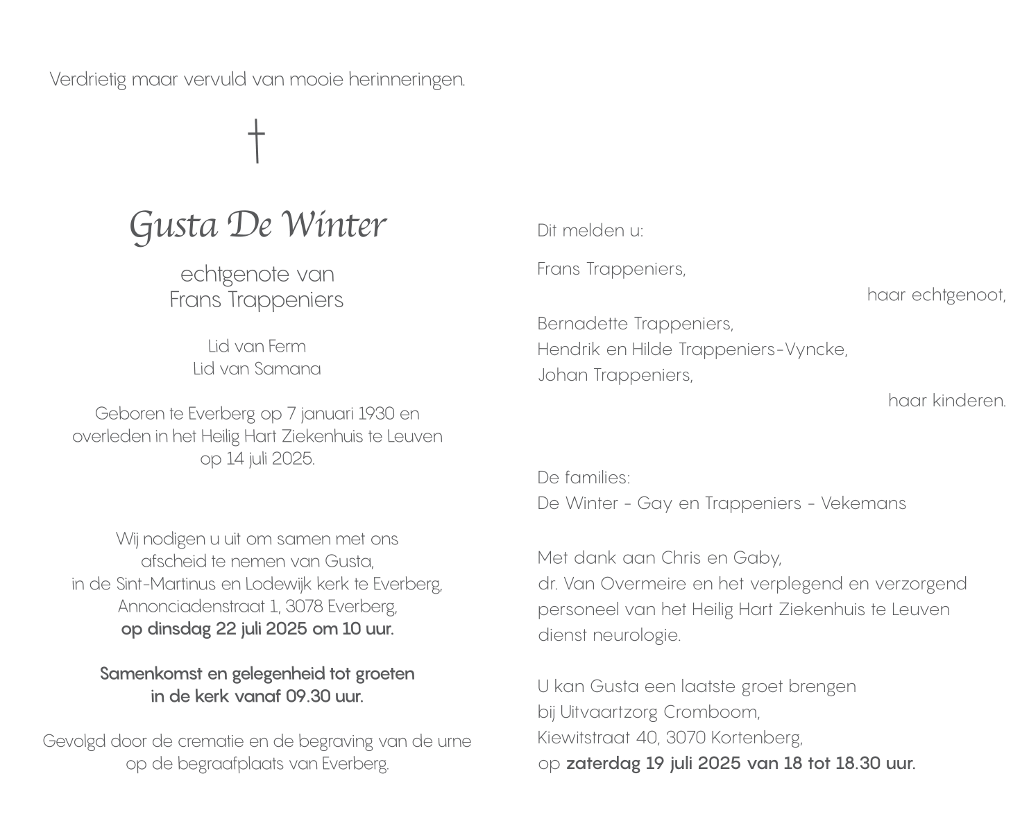 Fallecida en Leuven (3000) el lunes, 14 de julio de 2025 a la edad de 95 años
