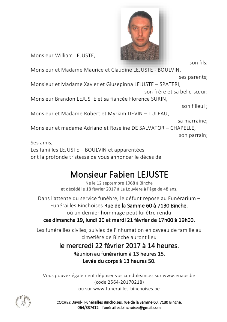 Died in Haine-Saint-Pierre (7100) on 18 February 2017 at the age of 48 years