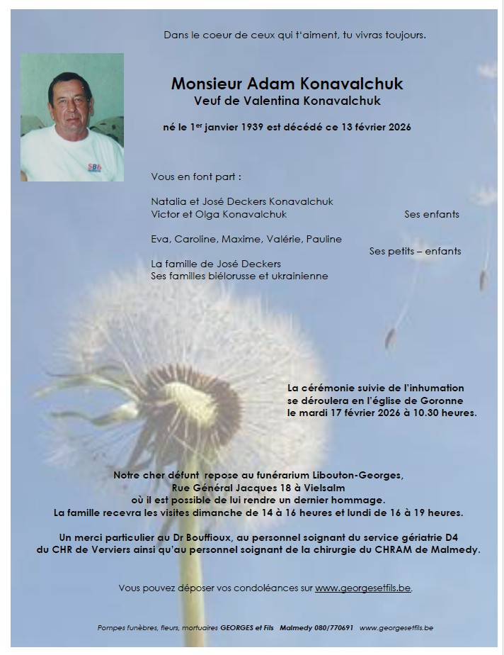Overleden te Verviers (4800) op vrijdag 13 februari 2026 op 87-jarige leeftijd