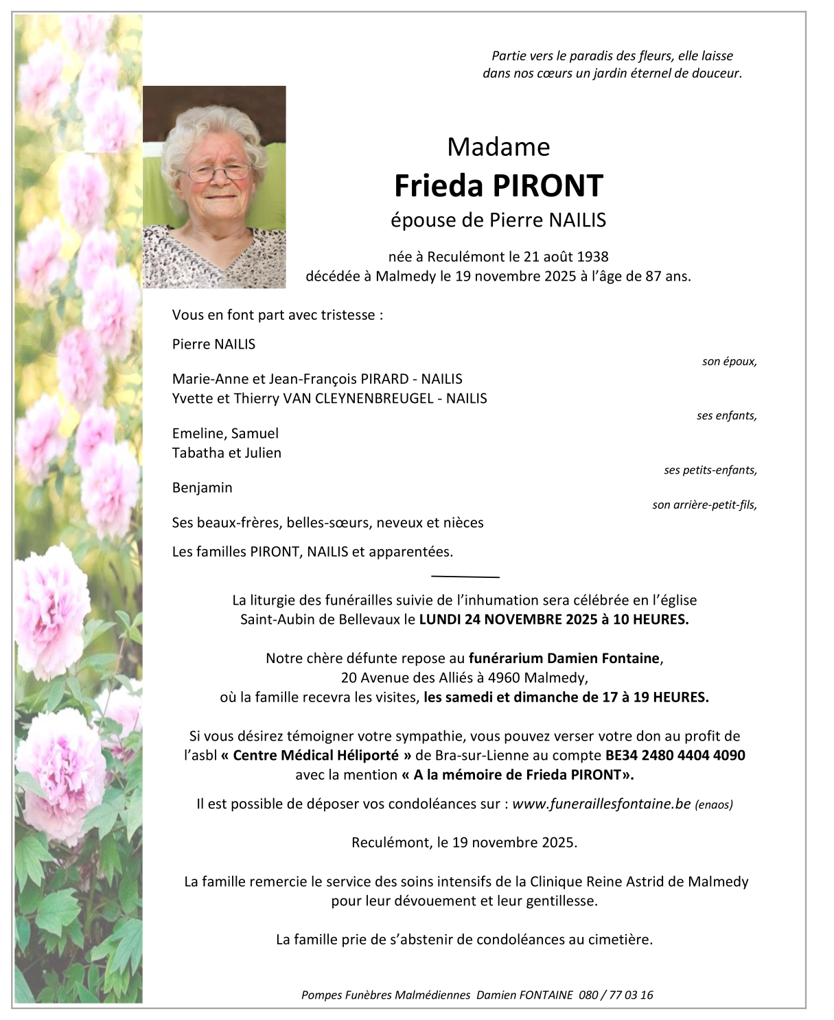 Died in Malmedy (4960) on 19 November 2025 at the age of 87 years