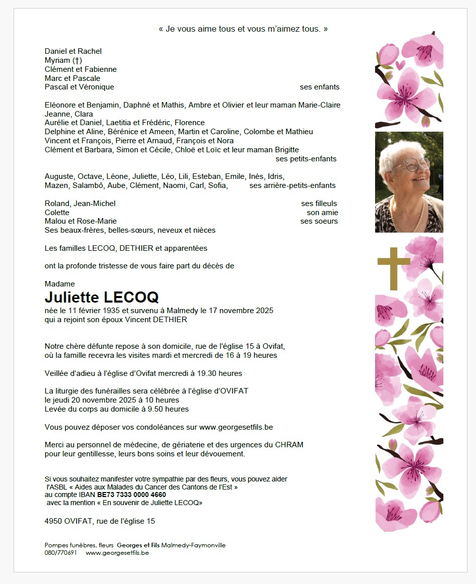 Décédée à Malmedy (4960) le lundi 17 novembre 2025 à l'âge de 90 ans