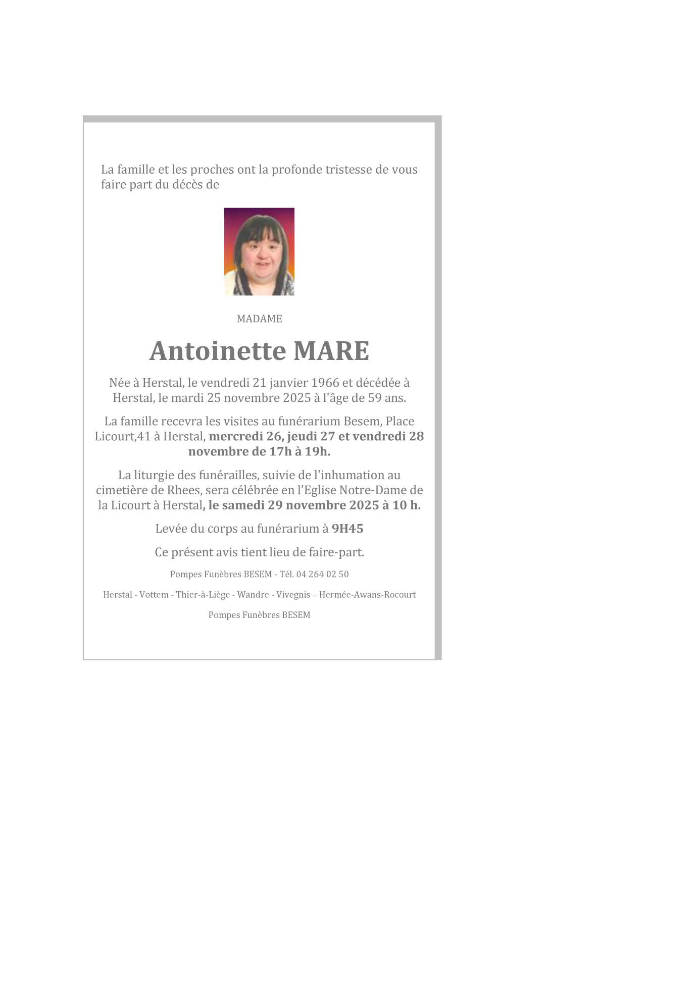 Fallecida en Herstal (4040) el martes, 25 de noviembre de 2025 a la edad de 59 años