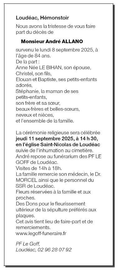 Fallecido en Loudéac (22600, Francia) el lunes, 8 de septiembre de 2025 a la edad de 84 años